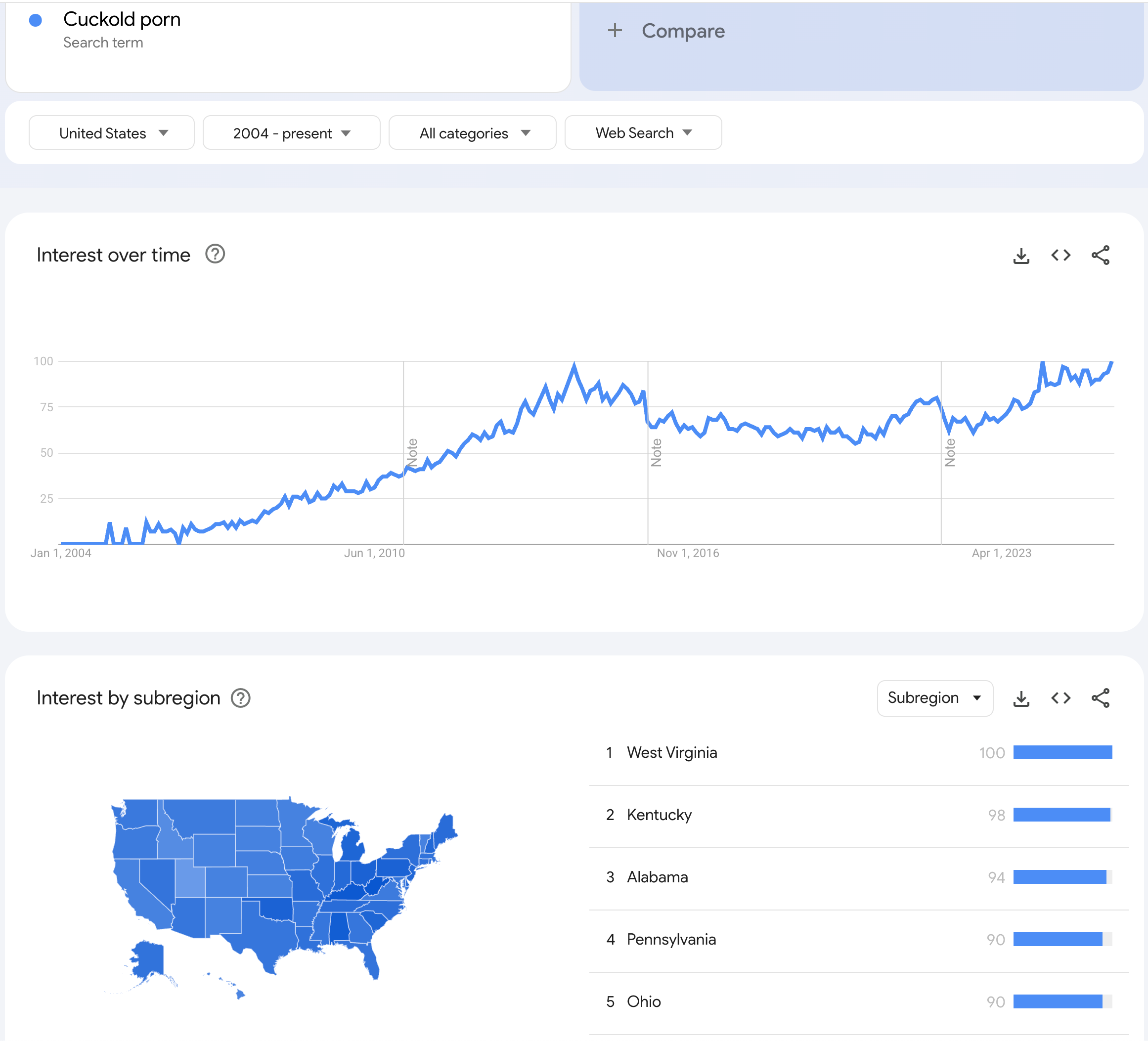 According to Google Trends, the number one state for “cuckold porn” searches is West Virginia. Followed by Kentucky, Alabama, Pennsylvania and Ohio.